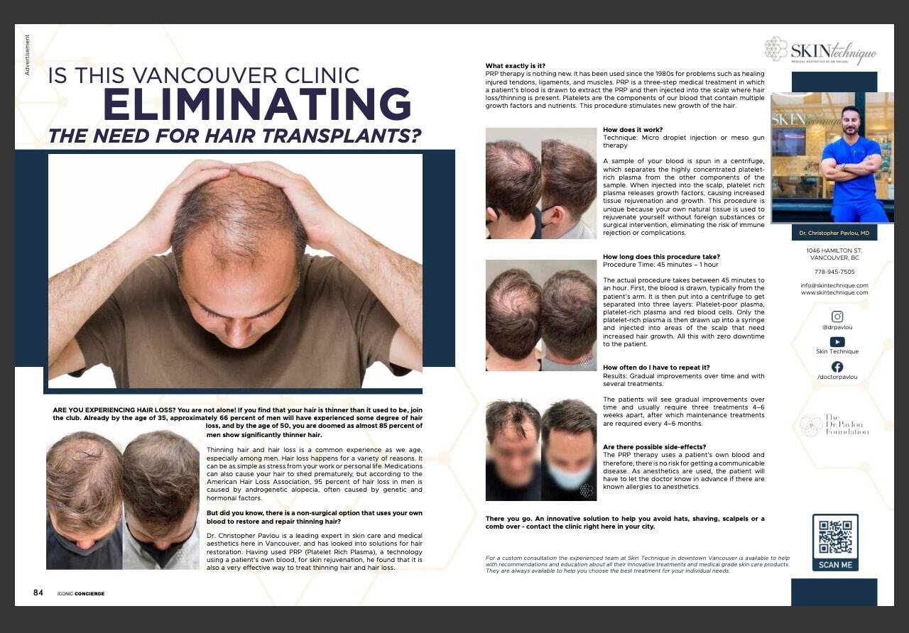 Dr. Christopher Pavlou is a leading expert in skincare and medical aesthetics here in Vancouver, and has looked into solutions for hair restoration. Using PRP (Platelet Rich Plasma), a technology using a patient’s own blood, for skin rejuvenation, he found that it is also a very effective way to treat thinning hair and hair loss.